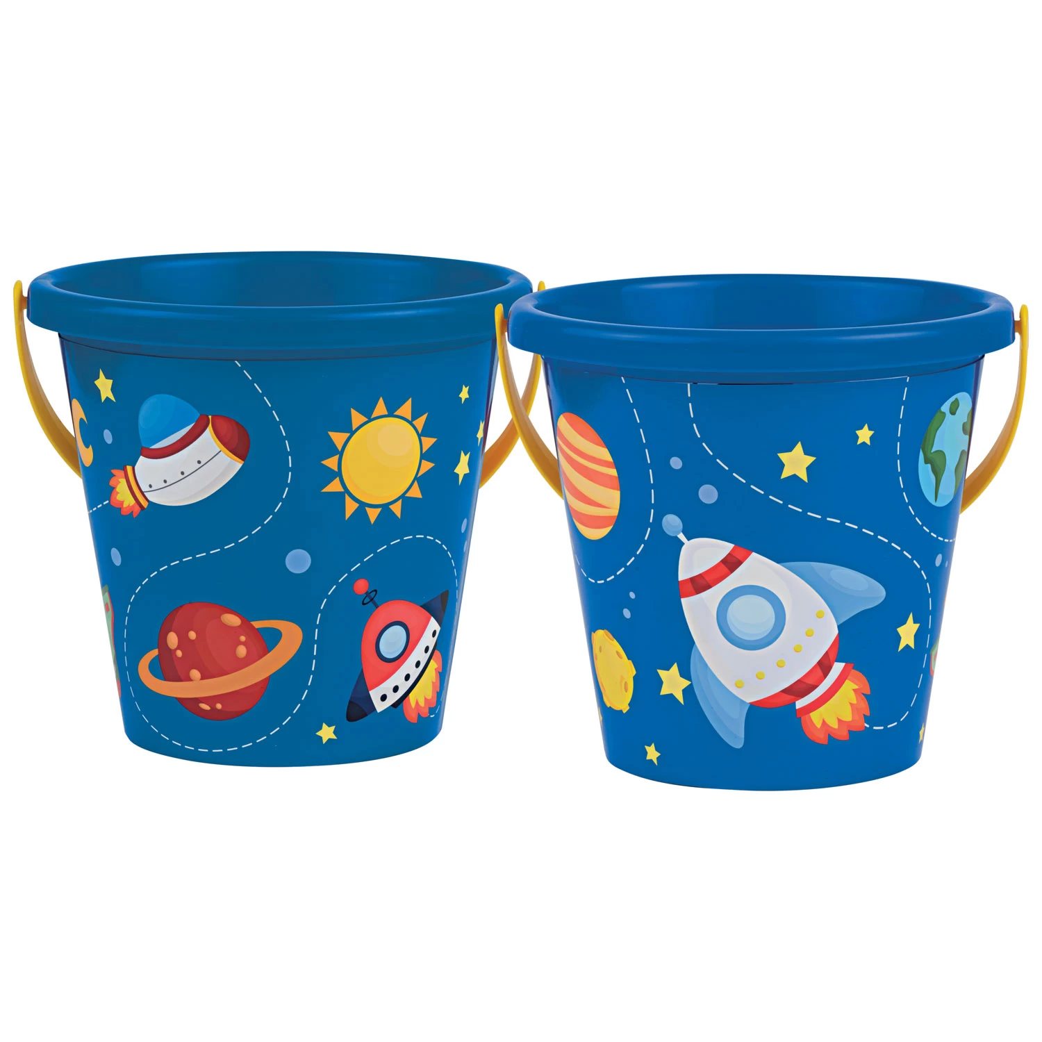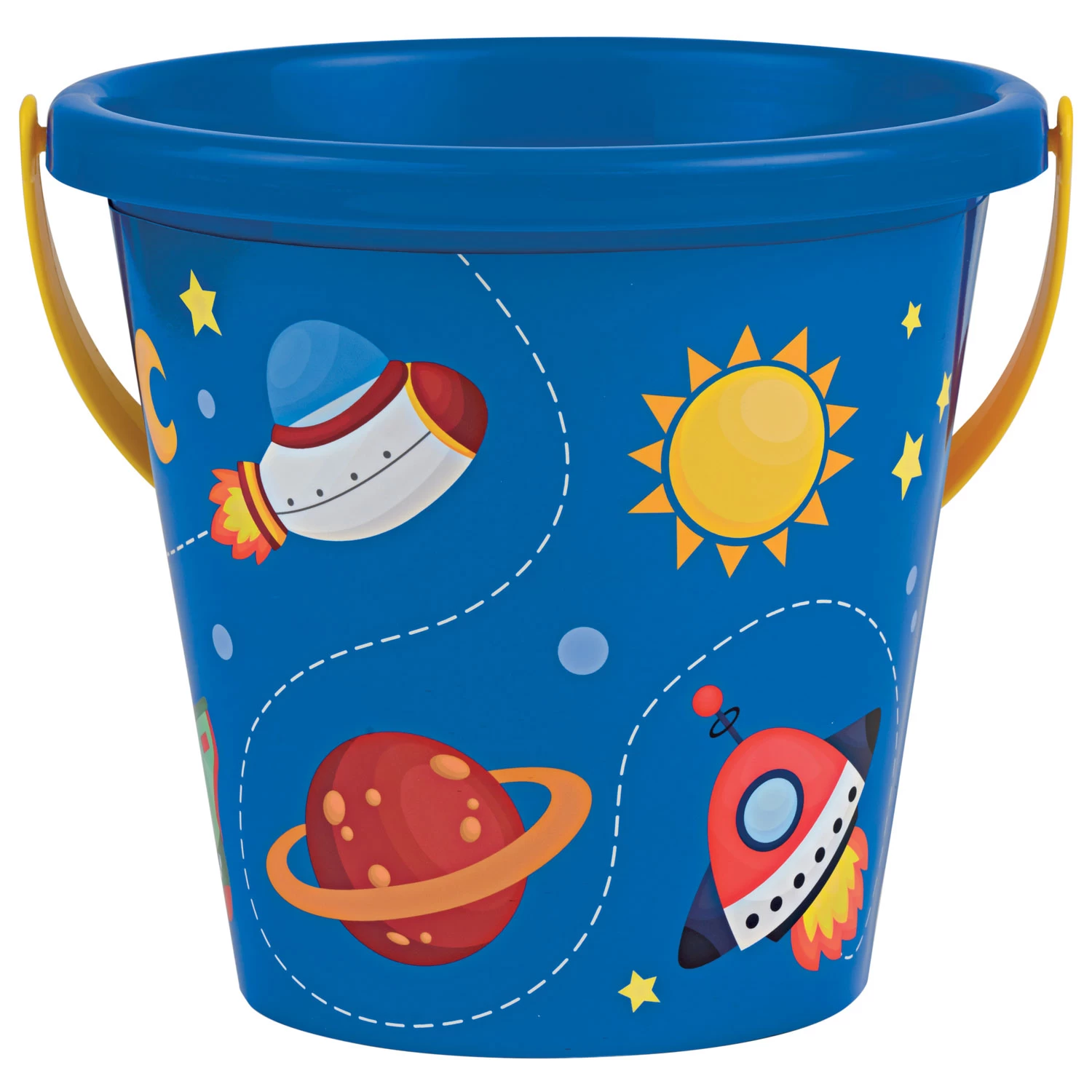 Blauwe emmer van kunststof met kleurrijk ruimtepatroon. De emmer heeft een diameter van 17 centimeter. Geschikt vanaf 12 maanden oud.