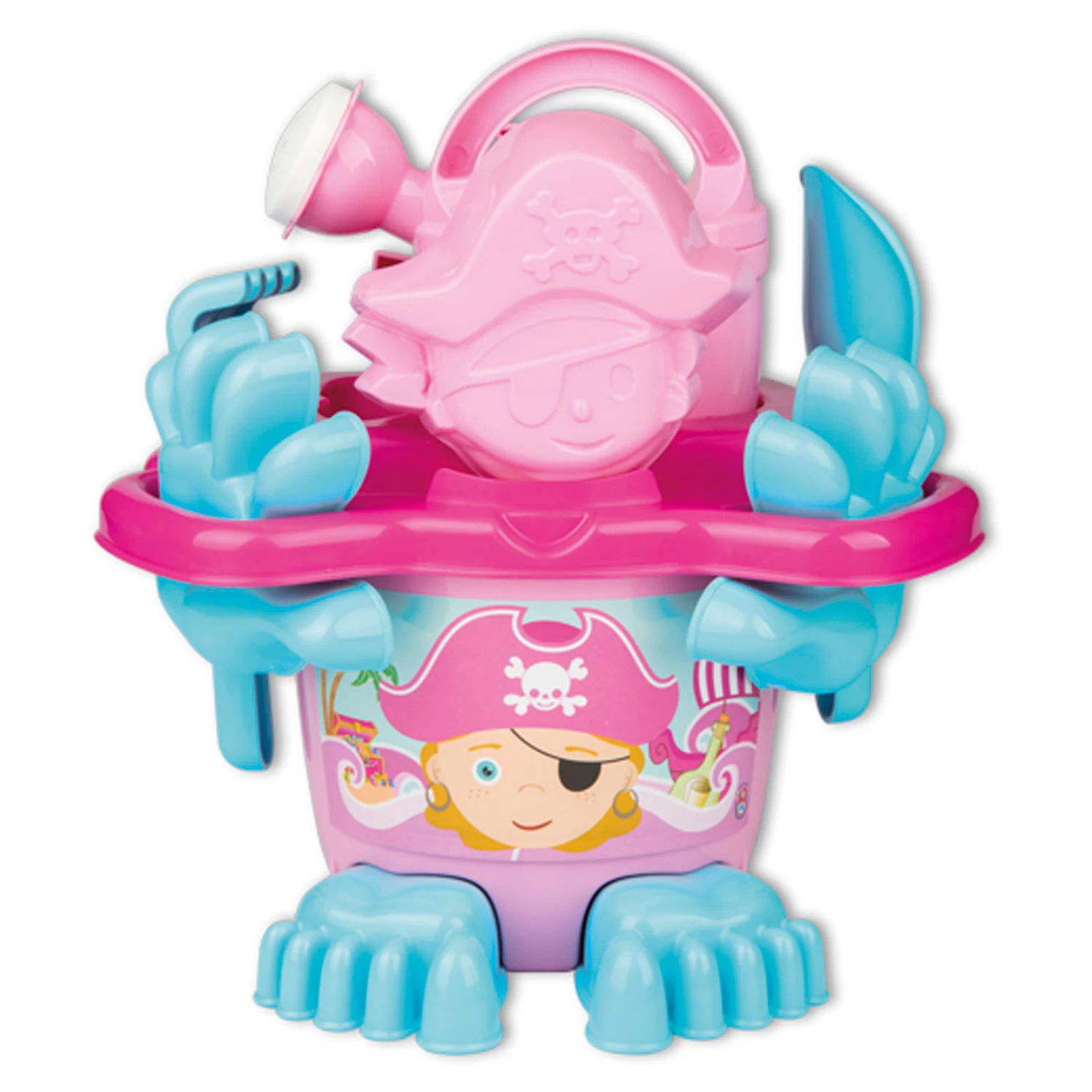 Ga het avontuur aan met deze stoere meiden piraten strandset. De strandset heeft roze en lichtblauwe kleuren en is gemaakt van kunststof. In de set zitten 6 zandvormpjes, een harkje, een schepje, een gieter en een zeef. De spulletjes zitten in een roze emmer met piraten opdruk die door de voetjes stevig in het zand blijft staan! De emmer heeft een doorsnede van 17 cm en is 28 cm hoog.
