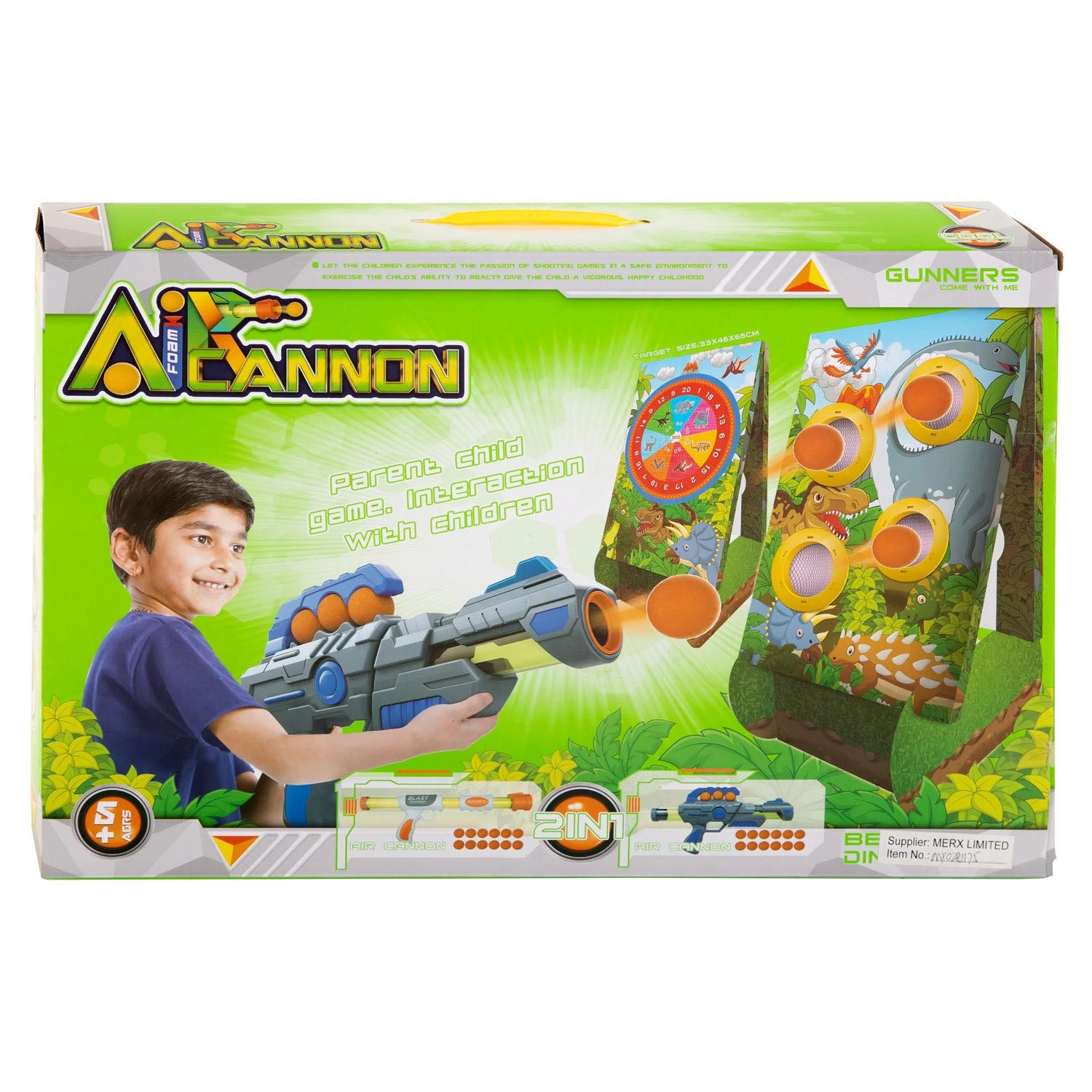 Daag je vriendjes uit voor een wedstrijd met de air cannon! Zet de kartonnen target klaar en de strijd kan beginnen. Pak allebei een air cannon en vul de blast popper met de oranje balletjes van foam. Klaar voor de start? Pompen en richten maar! Lukt het jou om de balletjes in het bovenste gat te krijgen of de 100 punten aan te raken van de schijf? In de set zitten twee air cannons, 8 foam balletjes en een dubbelzijdig, kartonnen target. LET OP! de foto’s op de verpakking wijken af van de speelgoedpistolen die in de set zitten. Set wordt geleverd zoals te zien is op afbeelding 3.