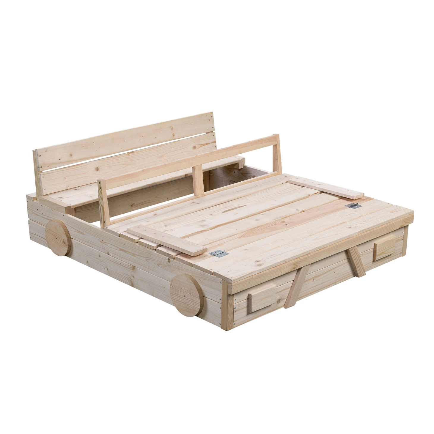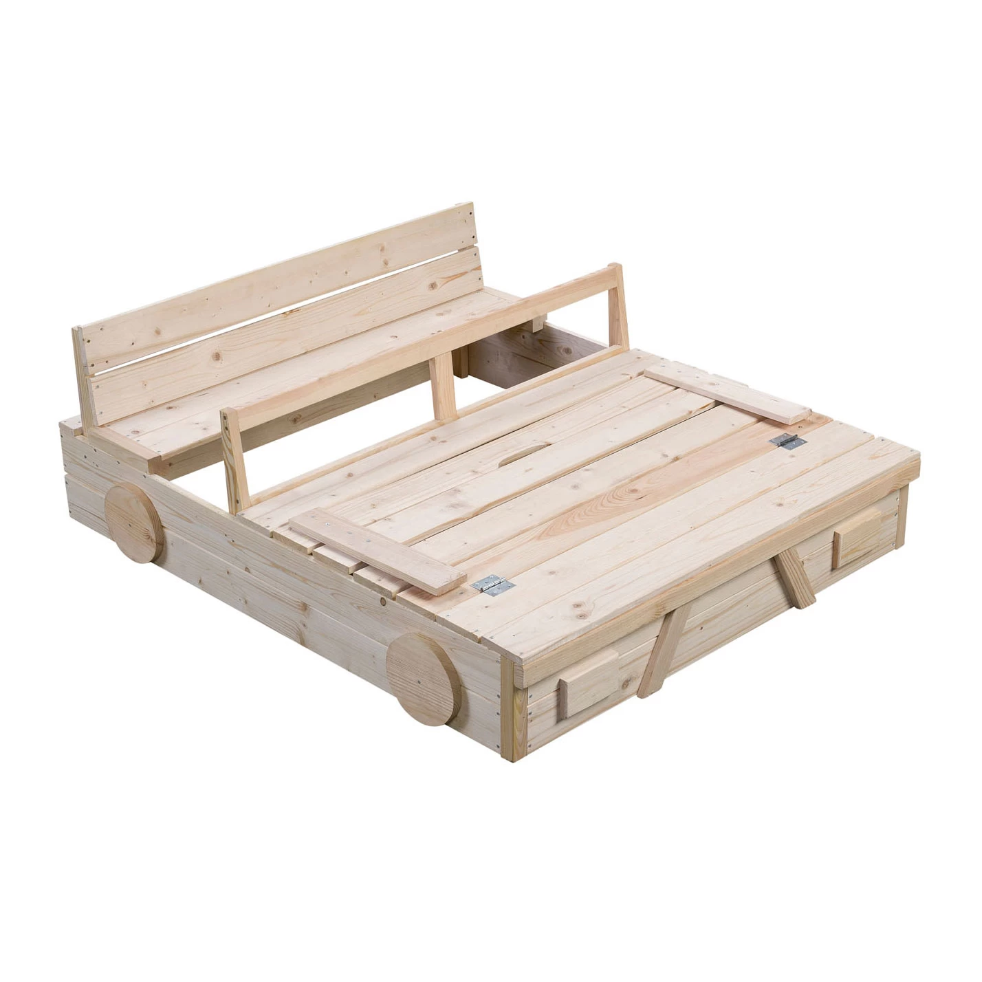 Zandbak gemaakt van blank hout in vorm van een auto. Bij het openen van de deksel veranderd deze in een handig bankje. Op aanraden de zandbak schilderen of beitsen. Zandbak bevat geen bodem.