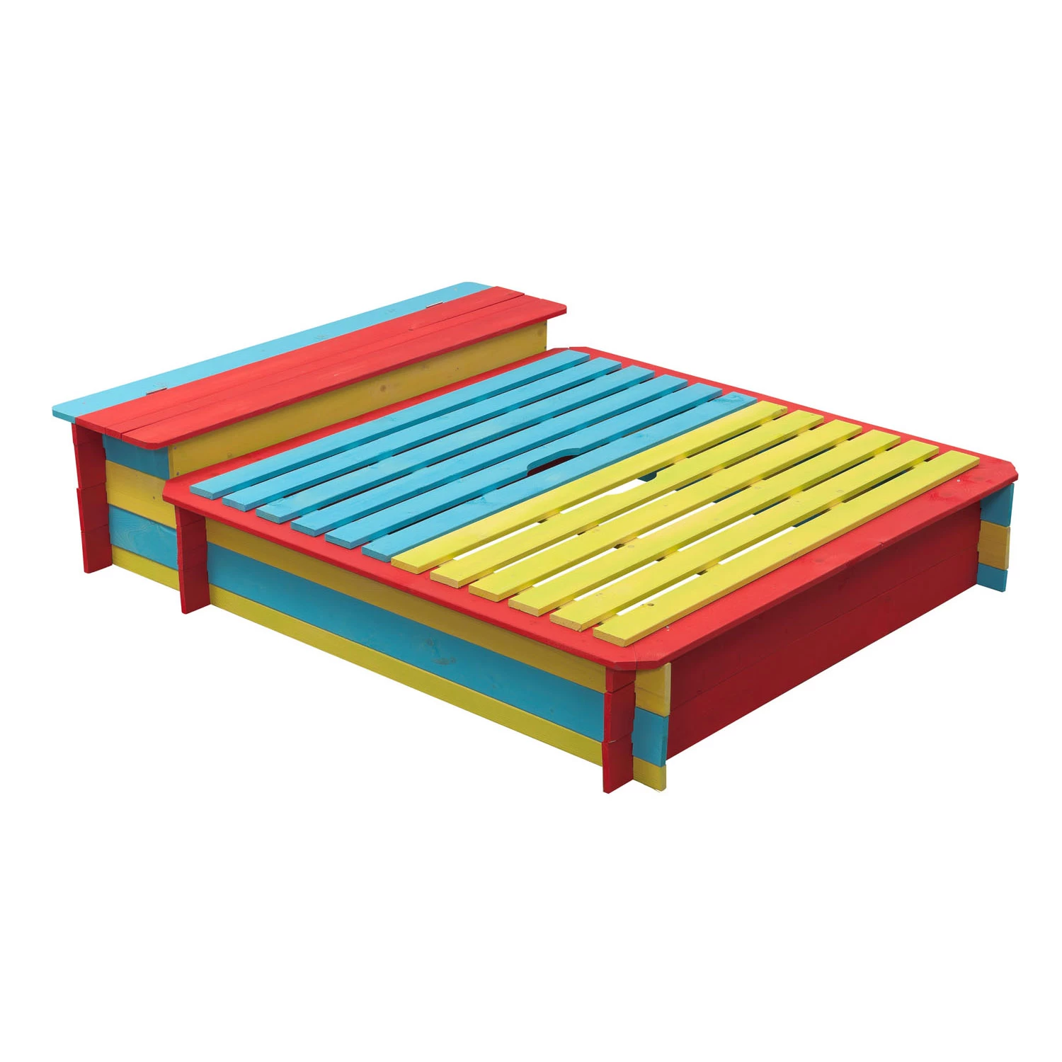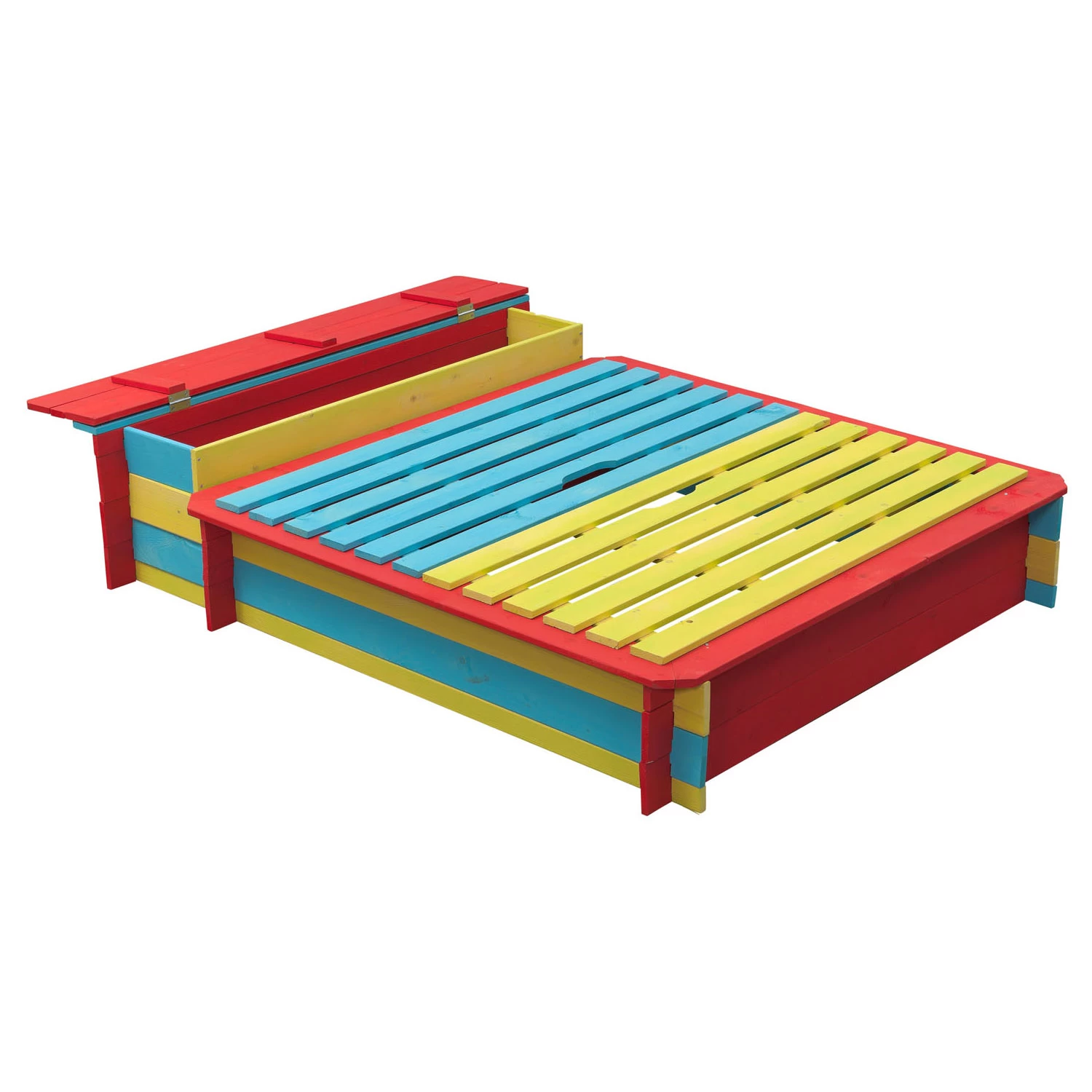 Vrolijk gekleurde zandbak dat voorzien is van twee deksels en een handig opberg vak. Bevat geen bodem.