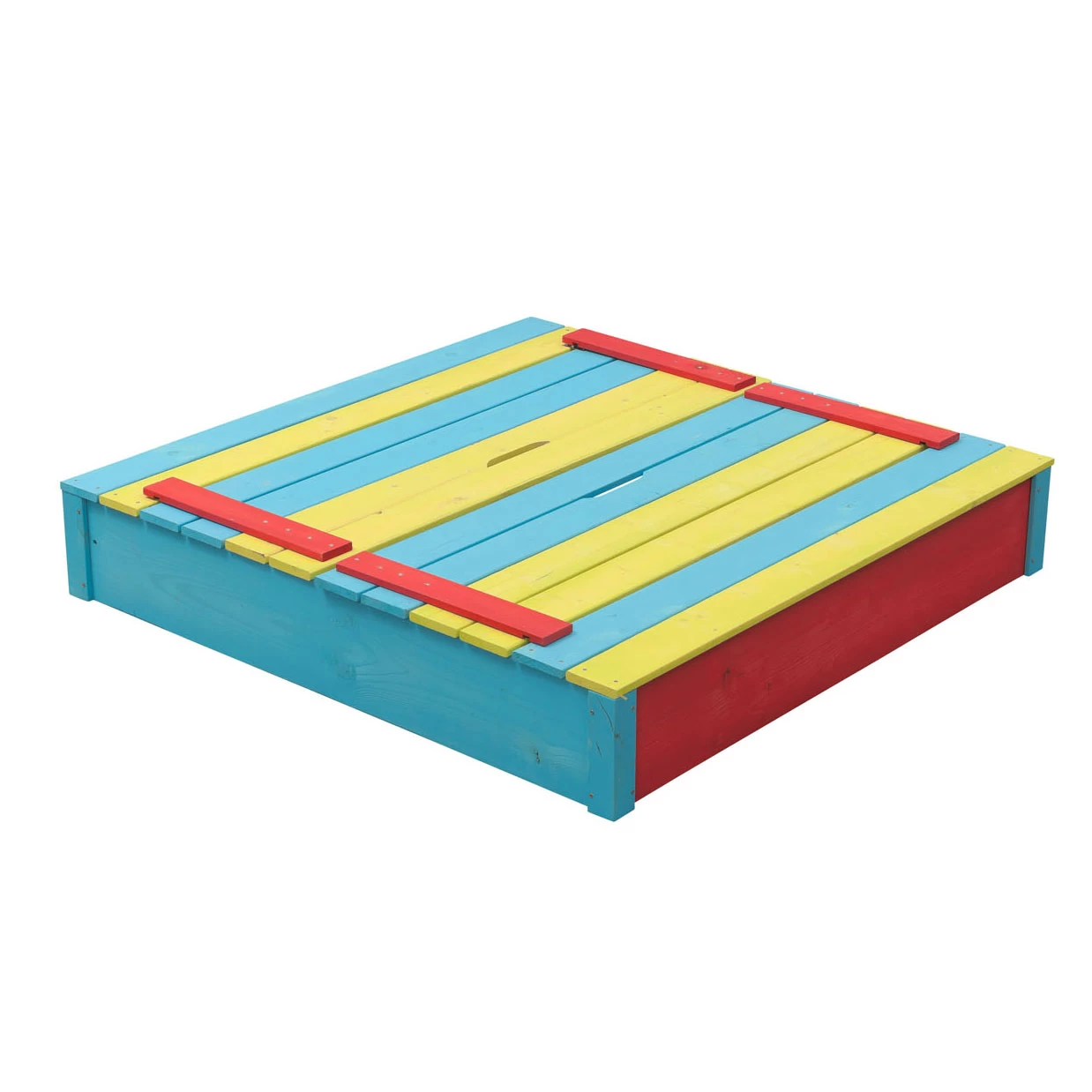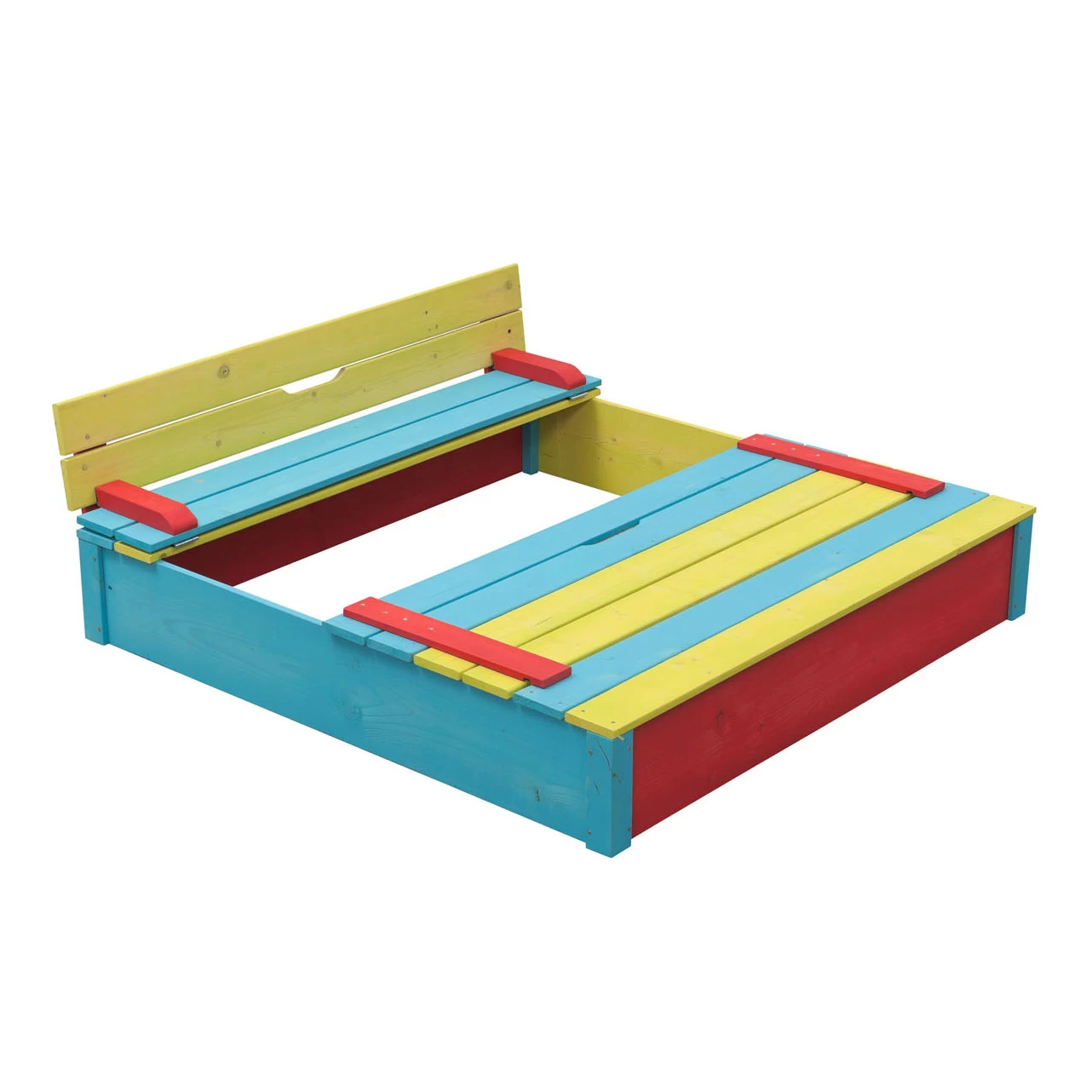 Leuk gekleurde zandbak met twee deksels die bij het openen transformeren in twee handige bankjes. Bevat geen bodem.