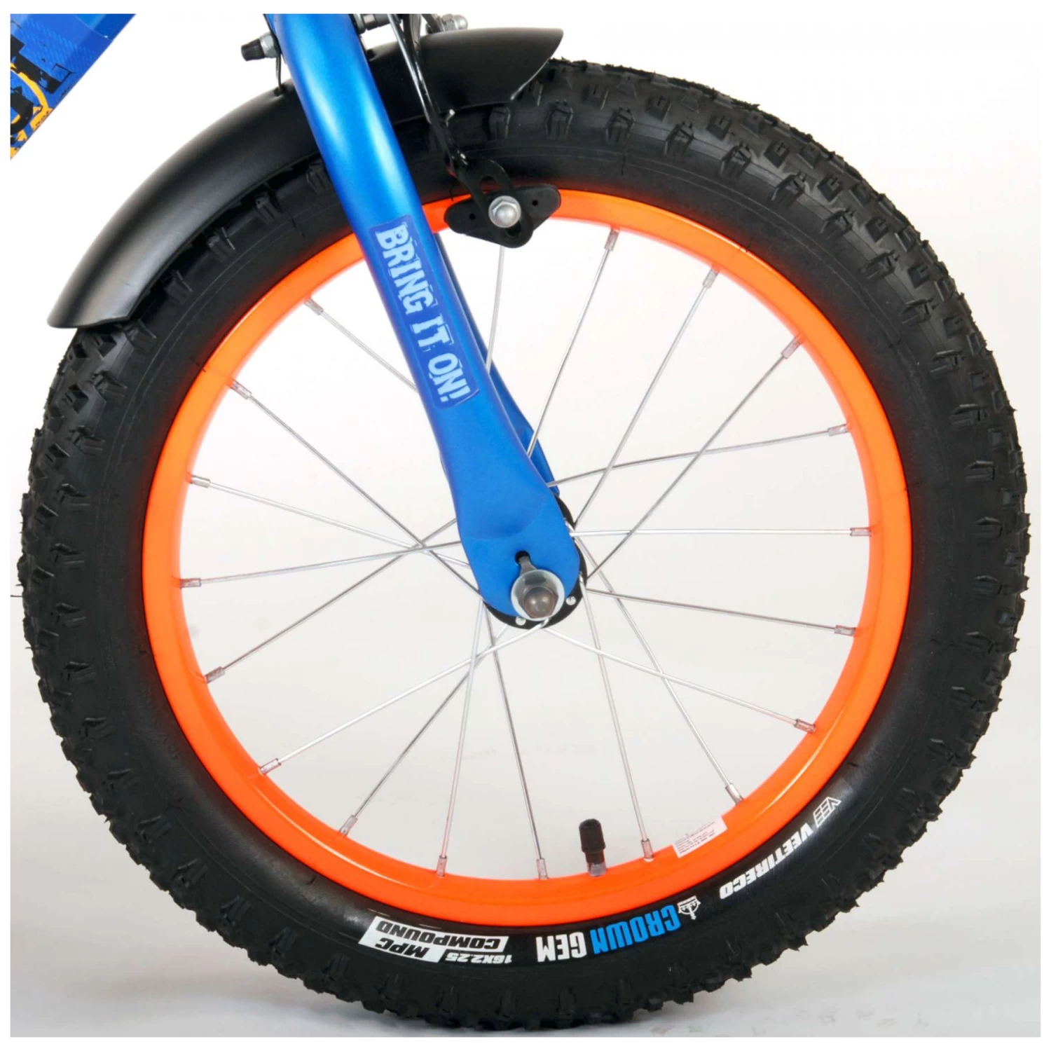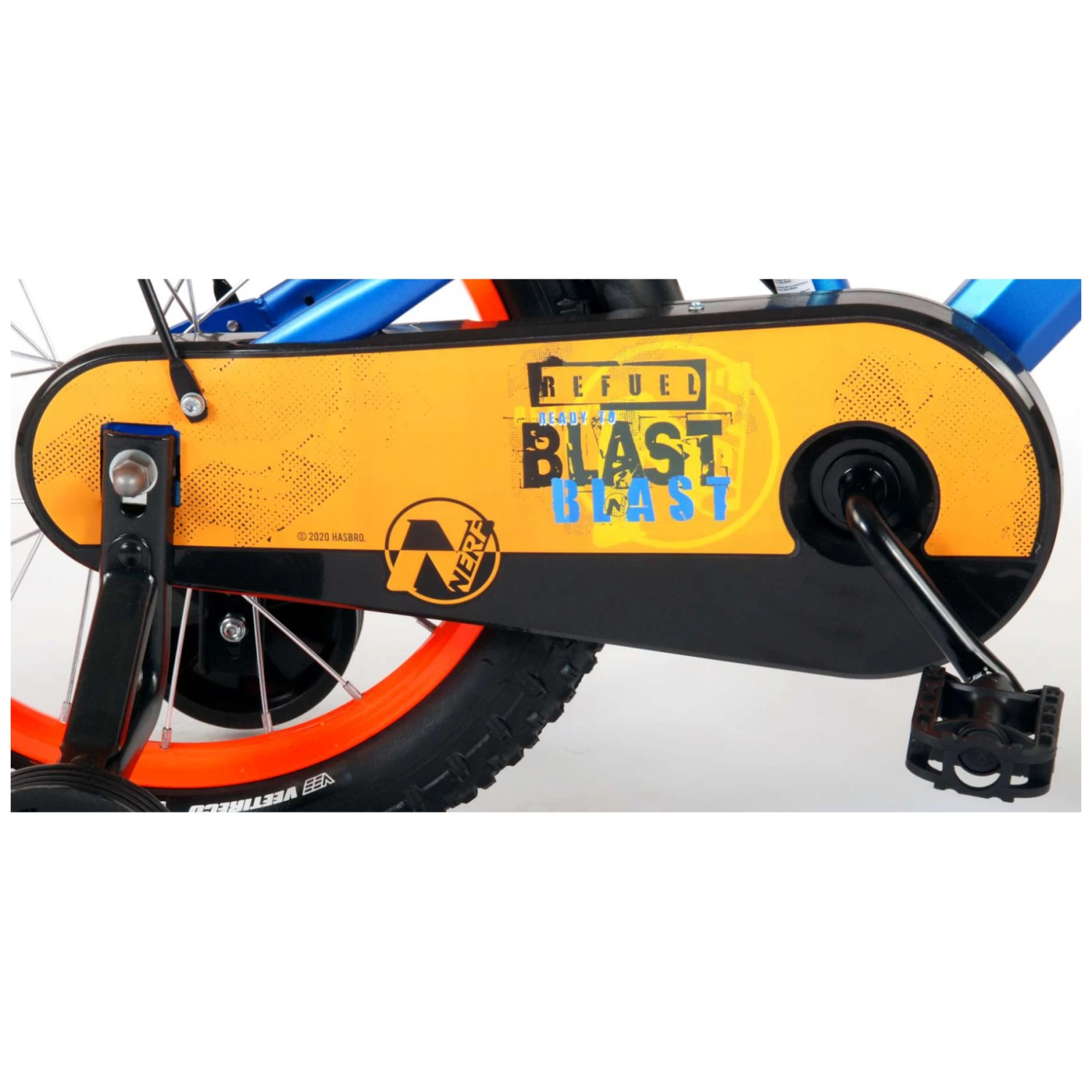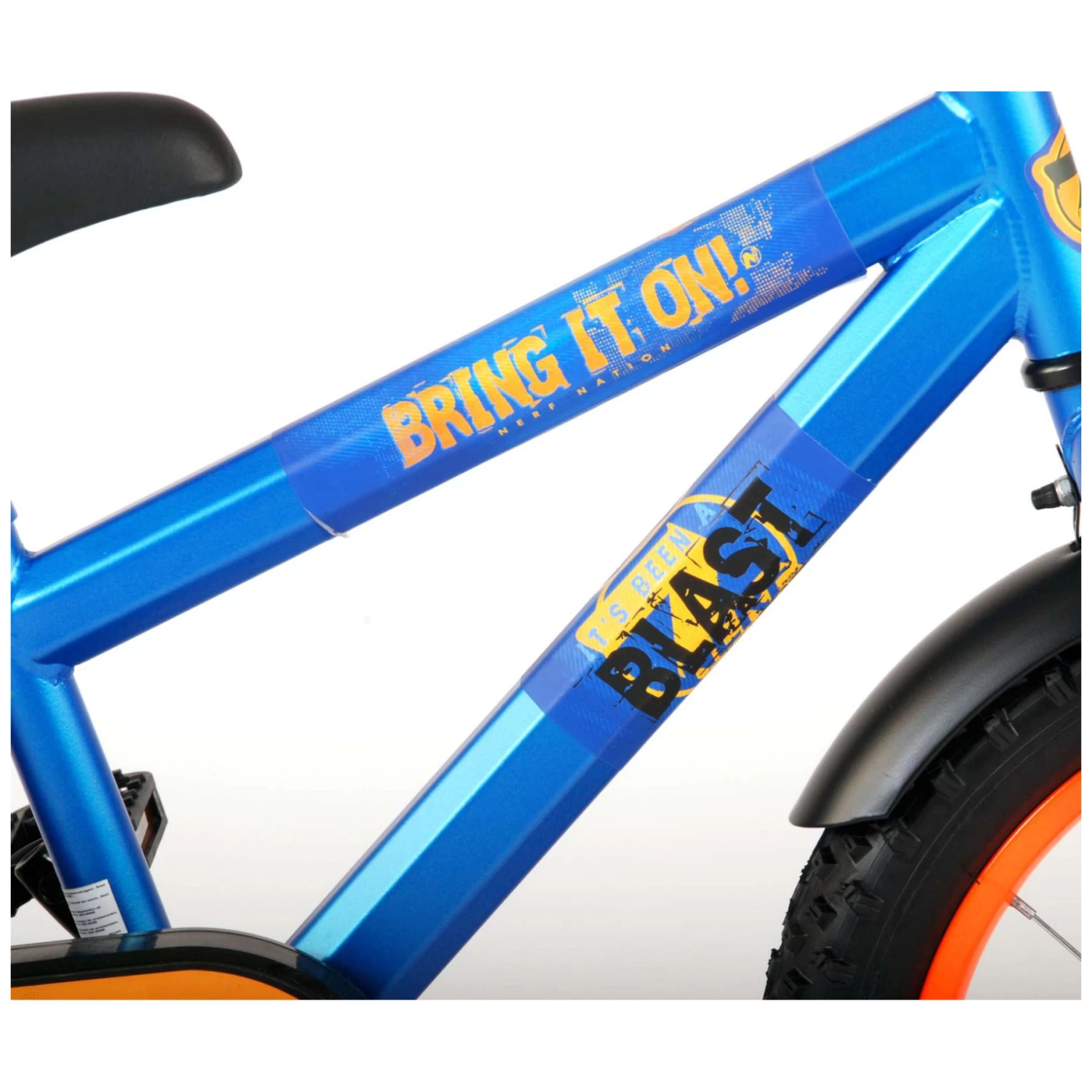 NERF 16 inch kinderfiets. De NERF games worden nóg spannender met de snelheid van deze stoere fiets. Deze super coole fiets is helemaal in de stijl van de oranjeblauwe NERF blasters. Het geometrische frame maakt van deze fiets een echte eyecatcher. De fiets heeft extra brede 16 inch fat tires, die de fiets geschikt maken voor jongens tussen de 4 en 6 jaar oud met kledingmaat 104-110. Ook de spatborden zijn extra groot en mooi gevormd waardoor zij al het opspattende vuil tegenhouden. Met de afneembare zijwielen kan ieder kindje snel leren fietsen. De handgrepen en het zadel zijn zacht voor extra comfort en met de bidonhouder inclusief bidon heb je altijd iets te drinken bij je. Ter bescherming van de kleine vingertjes is de kettingkast gesloten. De fiets is voor 85% afgemonteerd. It’s NERF or Nothin’!