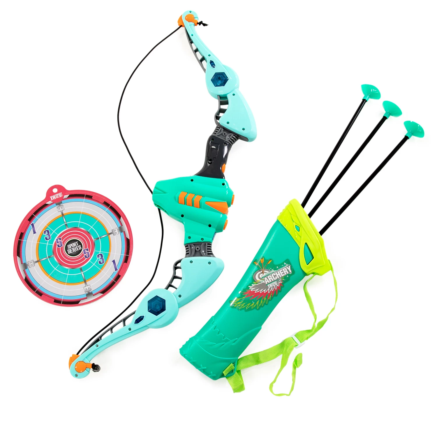 Oefen je boogschietkunsten met deze gave pijl- en boogset! De groene set bevat een stoere groene boog en een groene schoudertas waar je je 3 pijlen in kunt bewaren. De pijlen hebben zuignappen in plaats van punten. In de set zit ook een target die je op kunt hangen aan de muur, waarmee je kunt oefenen met richten. Schiet de pijlen af richting het bord en kijk hoeveel punten je verdiend hebt. De boog is 69 bij 20 centimeter. De pijlen zijn 56 centimeter lang. Het target heeft een diameter van 20 centimeter. Geschikt voor kinderen van 5 tot 10 jaar.
