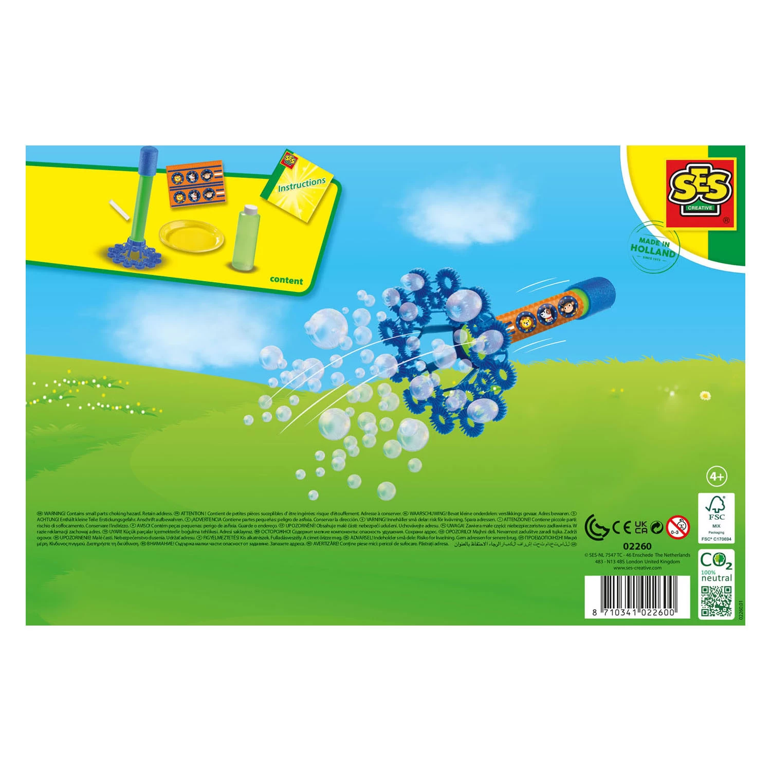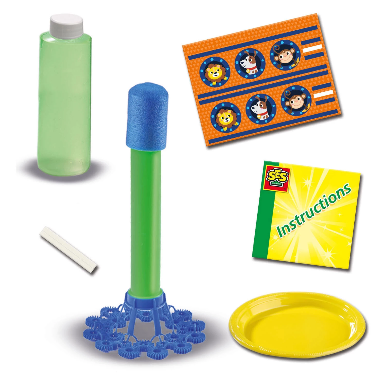 De Bellen raket gooien komt in twee delen met een stickervel dat om de raket kan worden geplakt. Bijgevoegd zijn instructies, een bordje, dubbelzijdig tape en 200ml SES Bubble sop.