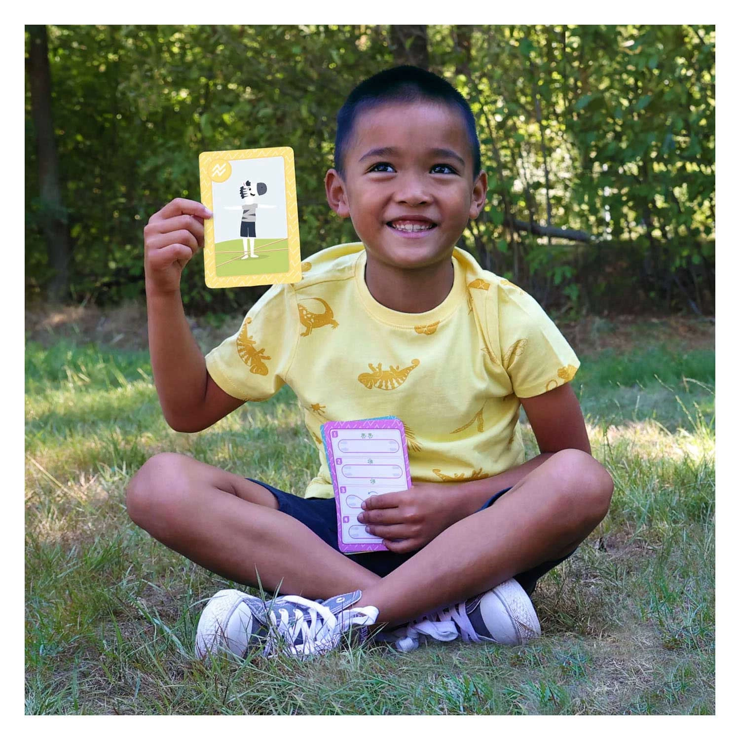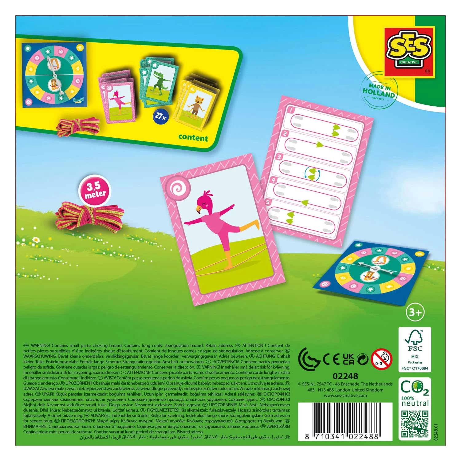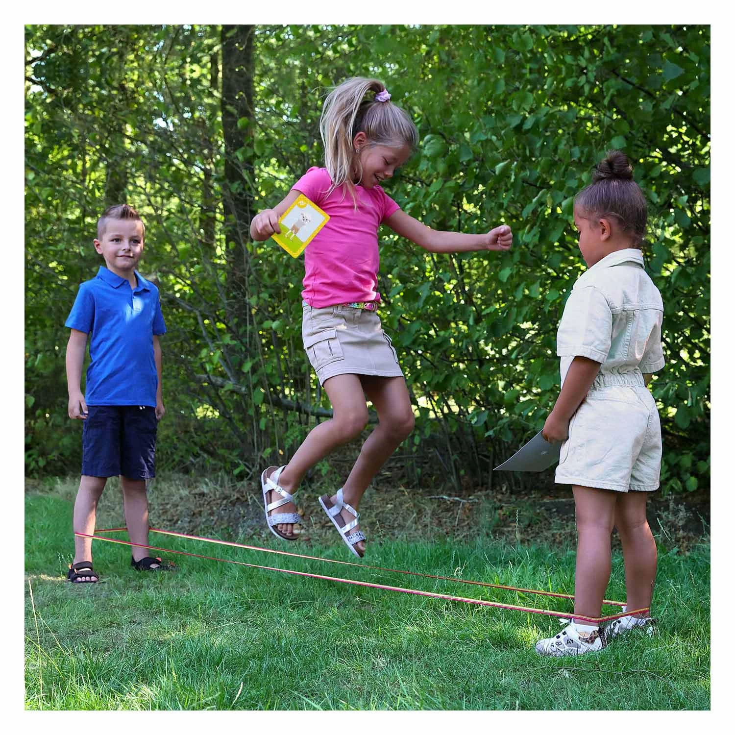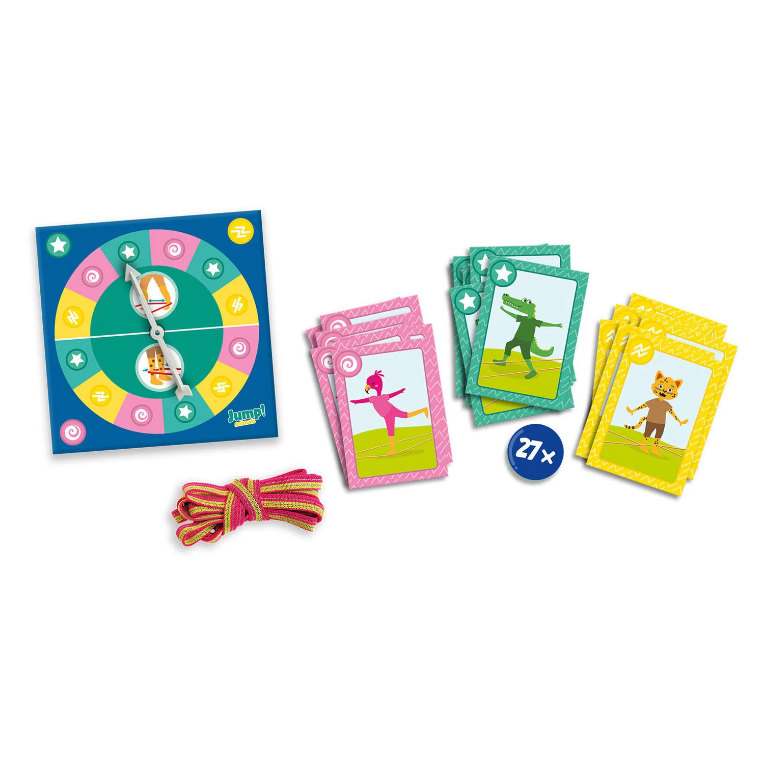 Jump! Animals bestaat uit een elastiek met glitter van 3,5 meter, een spinnerbord met draaibare pijl en 27 speelkaarten met sprongen en trucs.