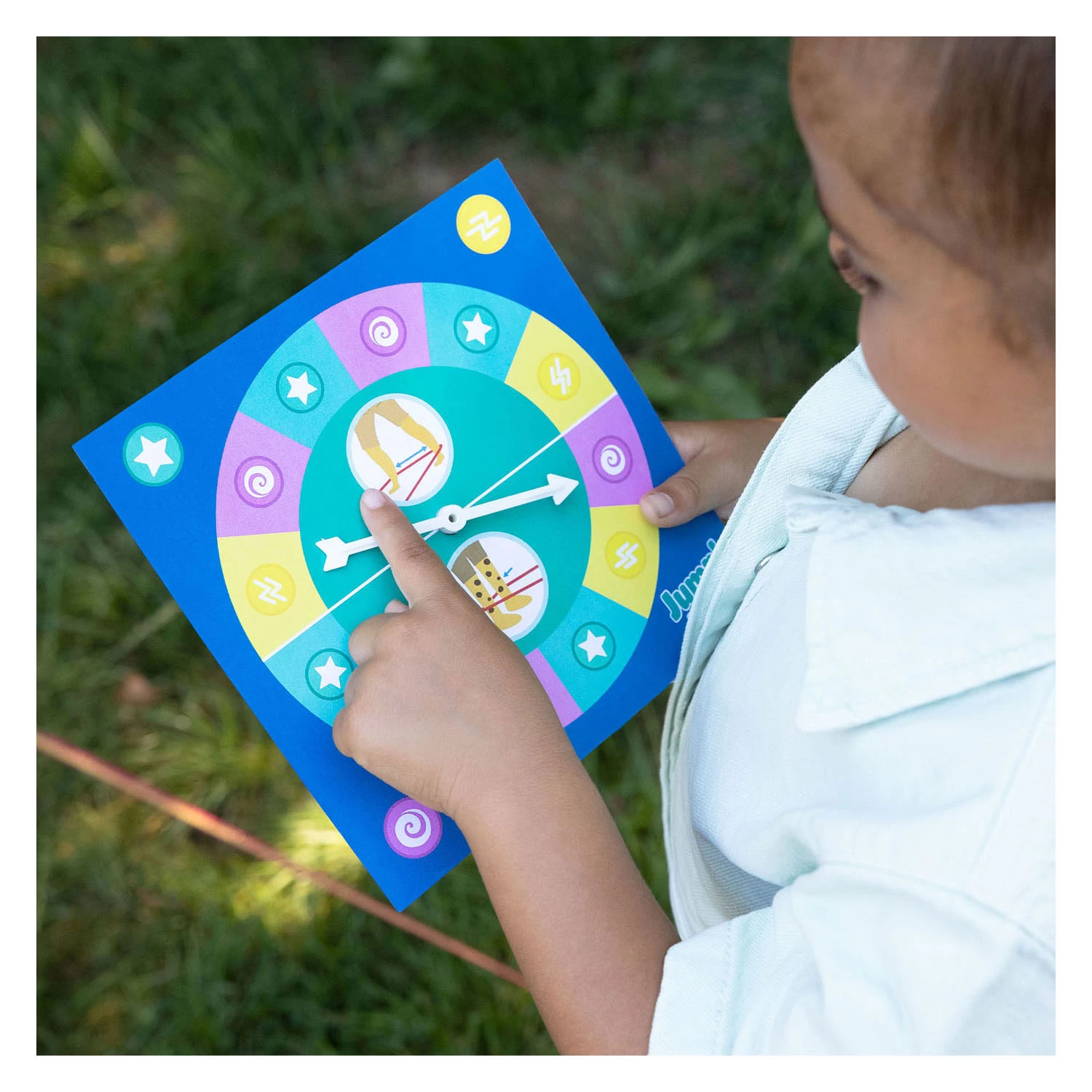 Elastieken met een twist; dat is Jump! Animals. Het spinnerbord bepaalt welk type coole truc moet worden uitgevoerd en hoe het toffe glitter elastiek gespannen staat. De 27 speelkaarten met gave dieren laten zien hoeveel verschillende trucs jij kunt doen. Spring, draai en stamp! Animals is hét spel om samen met al jouw vrienden te spelen. Hoeveel trucs kun jij? Eén, twee, drie, Jump!