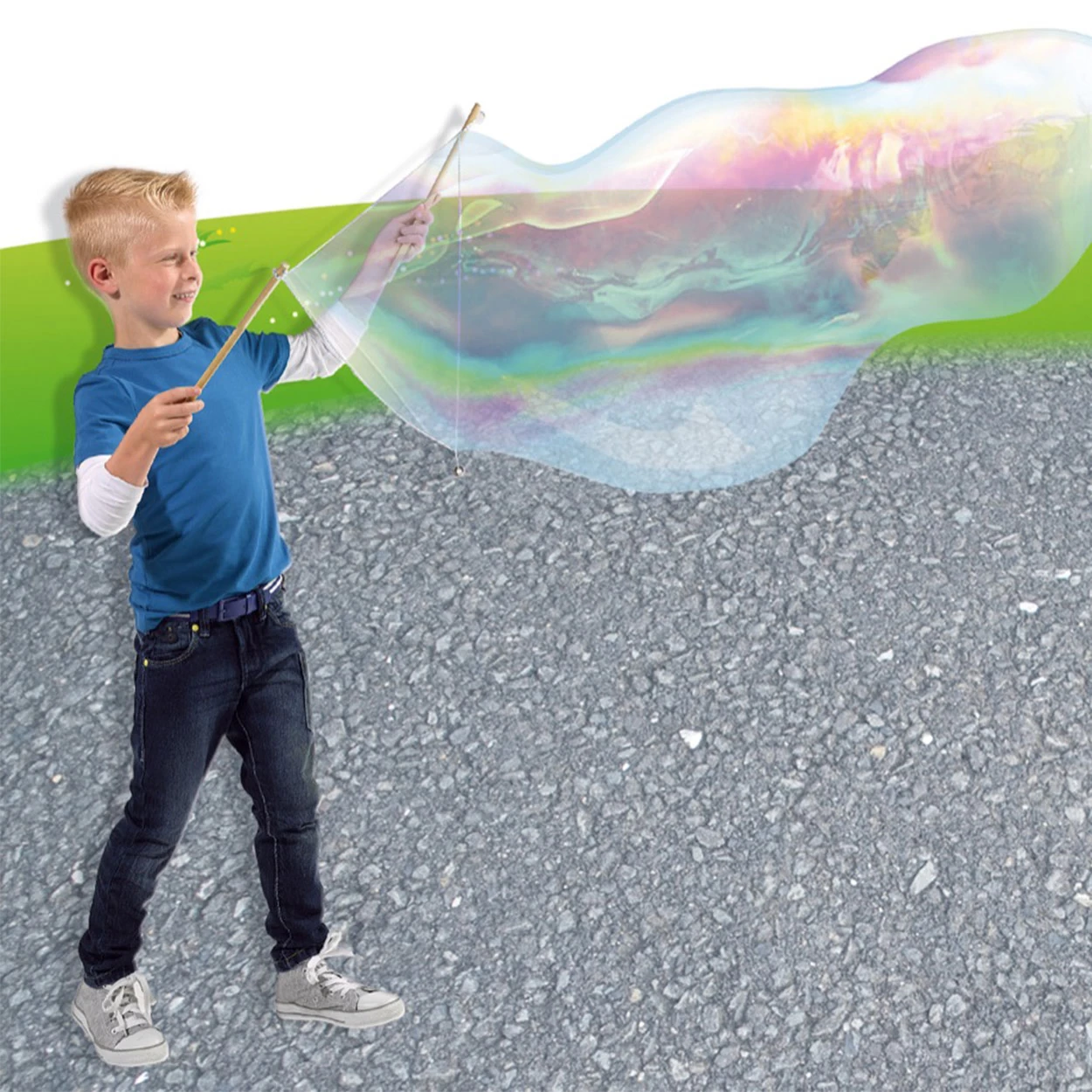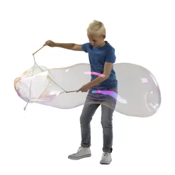 Artnr. SES 02251. Wie maakt de grootste bellen? Met de Mega Bubble set van Ses maakt iedereen gemakkelijk mega grote bellen. Houd de stokjes bij elkaar en doop het touw in het extra sterke zeepsop. Wanneer je de stokjes voorzichtig uit elkaar trekt ontstaat er een bel. Door vervolgens achteruit te lopen wordt de bel steeds groter.