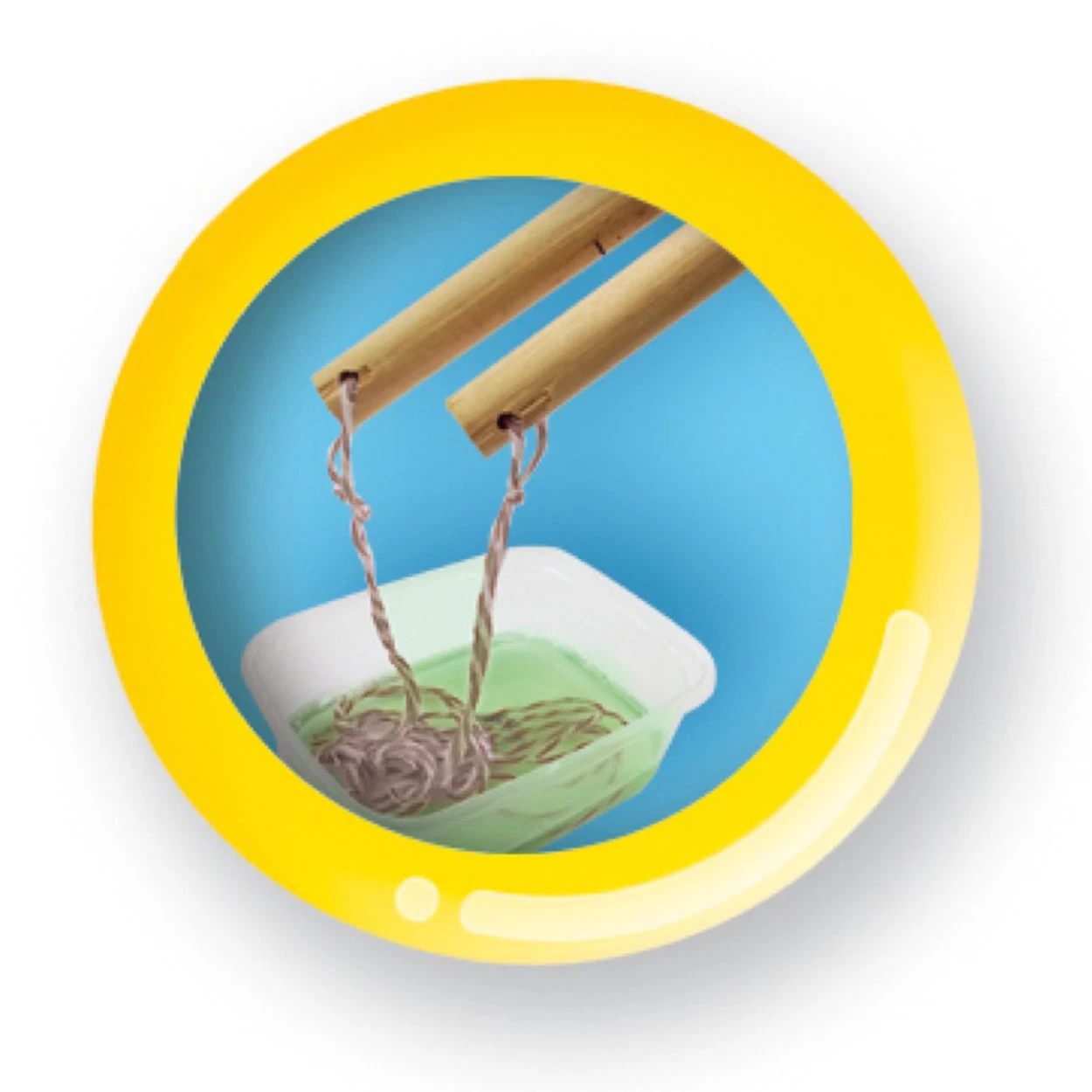 Als je de bel groot genoeg vindt doe je de stokjes weer bij elkaar en laat je de mega bel door de lucht vliegen. Door zachtjes tegen de rand van de grote bel te blazen ontstaat er een klein belletje in de mega bel.