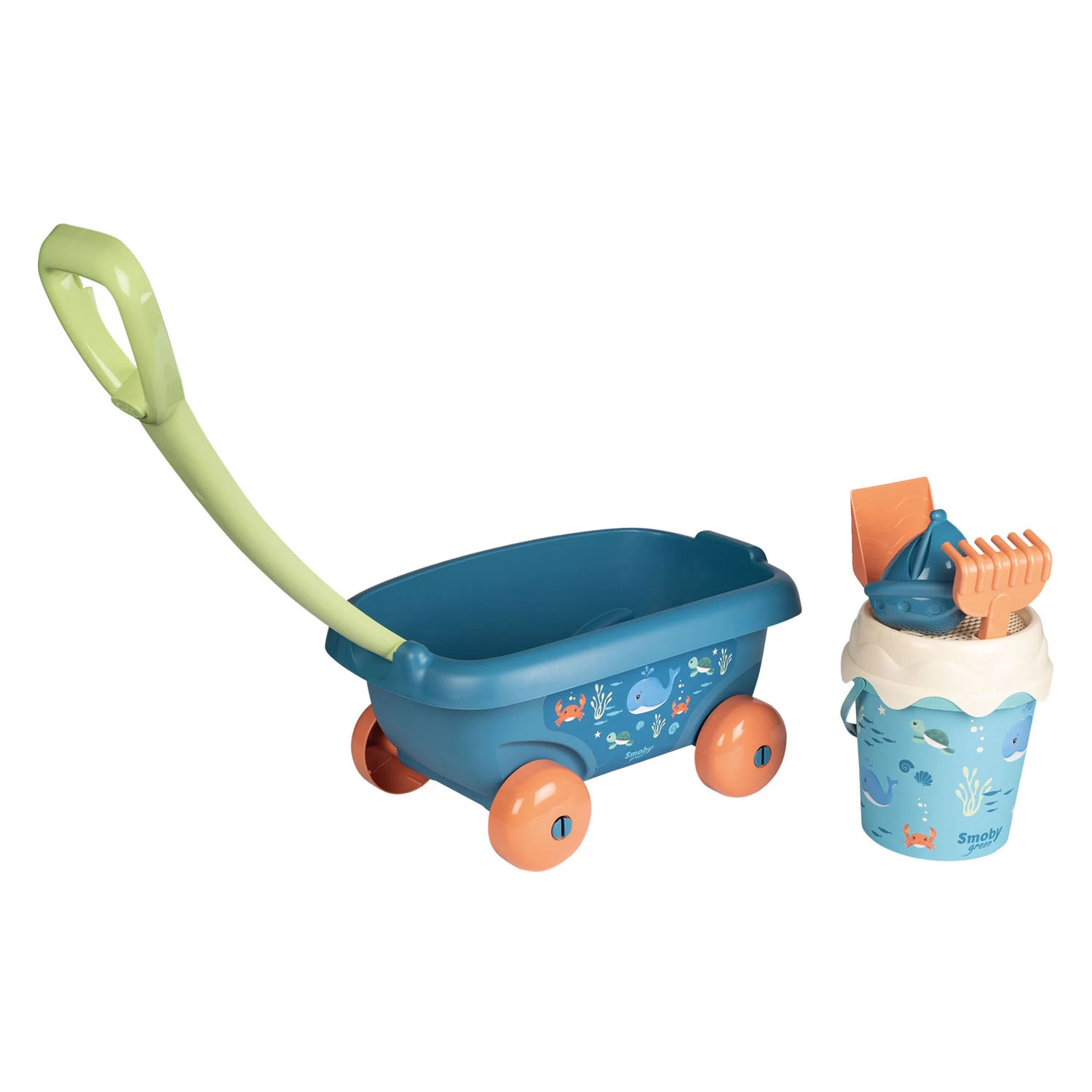 Voor heerlijke dagen op het strand of uren spelen in de zandbak: deze leuke Smoby strandkar met zandspeelgoed neem je overal mee naartoe! De 6-delige set bestaat uit een blauwe bolderkar met trekstang, een emmer met zeefdeksel, een hark en schep en een zandvorm.
