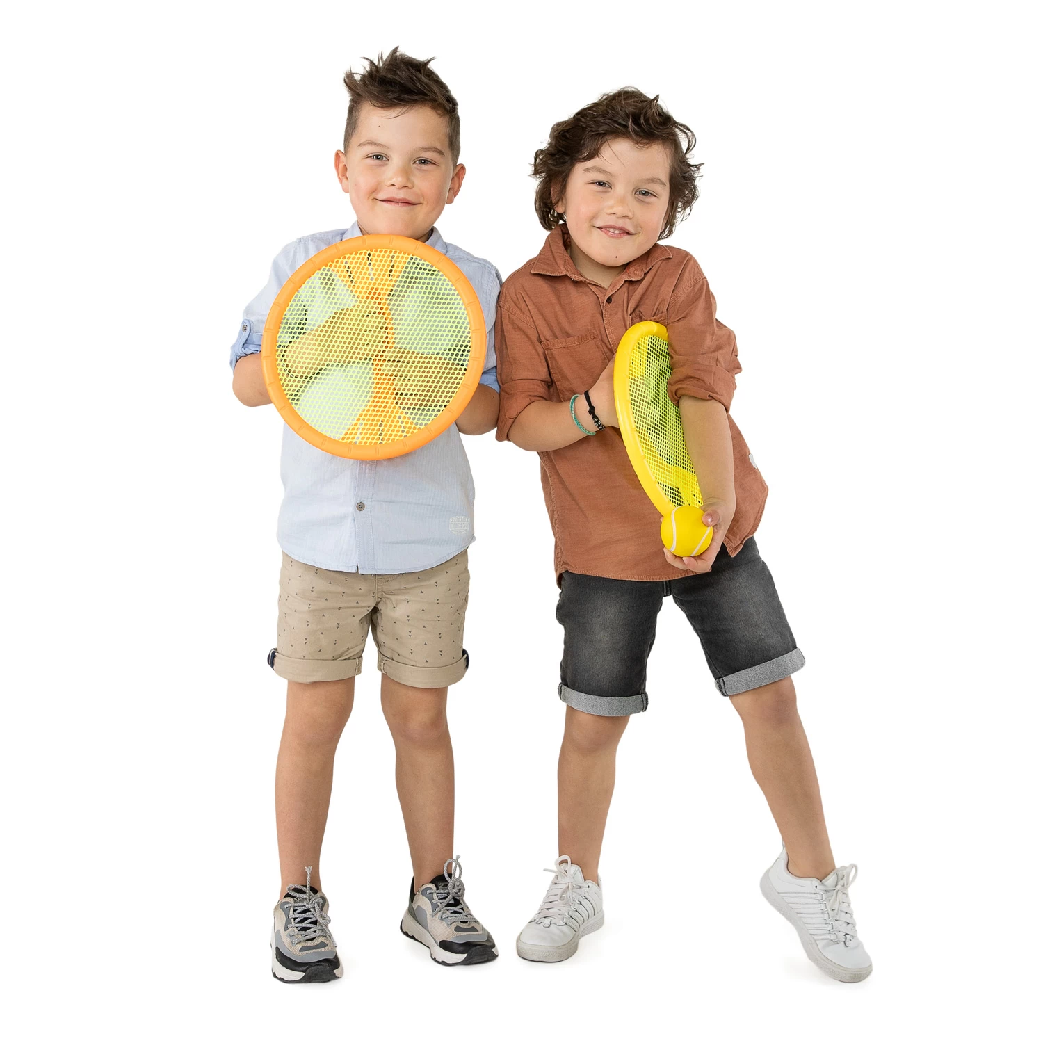 Speel een potje tennis met deze tennis schijven! De schijven zijn gemaakt van stevige kunststof ringen met een gespannen netje. Laat de foambal tegen het netje stuiteren en speel hem weer terug naar de andere speler. Hoe vaak kunnen jullie overgooien zonder dat de bal op de grond valt? Ook leuk voor op het strand! De set bestaat uit 2 tennisschijven en een bal.