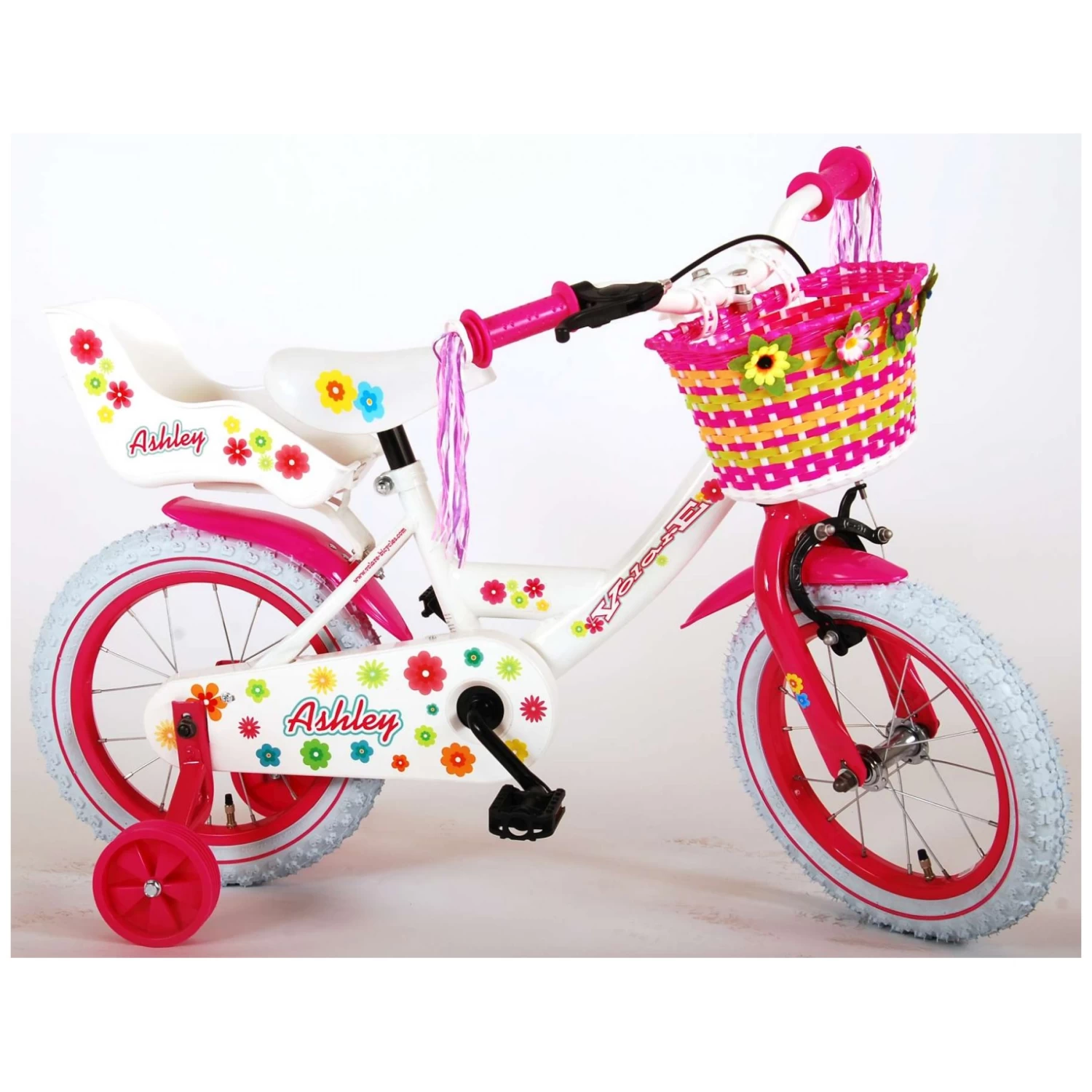 Volare Ashley meisjesfiets 14 inch. De Volare Ashley fietsen zijn geschikt voor alle fleurige dametjes. Zowel het frame van de fiets als het praktische kunststofmandje zijn voorzien van een prachtig bloemetjesdesign. De fiets beschikt over makkelijk afneembare zijwieltjes om snel te kunnen leren fietsen, een stevige handrem en een achteruittraprem. Bovendien heeft de fiets een poppenzitje, zodat ieder dametje haar pop veilig kan vervoeren en zelf haar handjes aan het stuur kan houden. Een top fiets voor een lage prijs! Deze fiets is voor 95% afgemonteerd, dus bijna fietsklaar. Wel zo gemakkelijk!