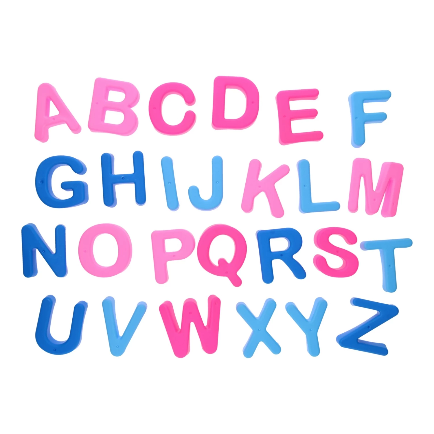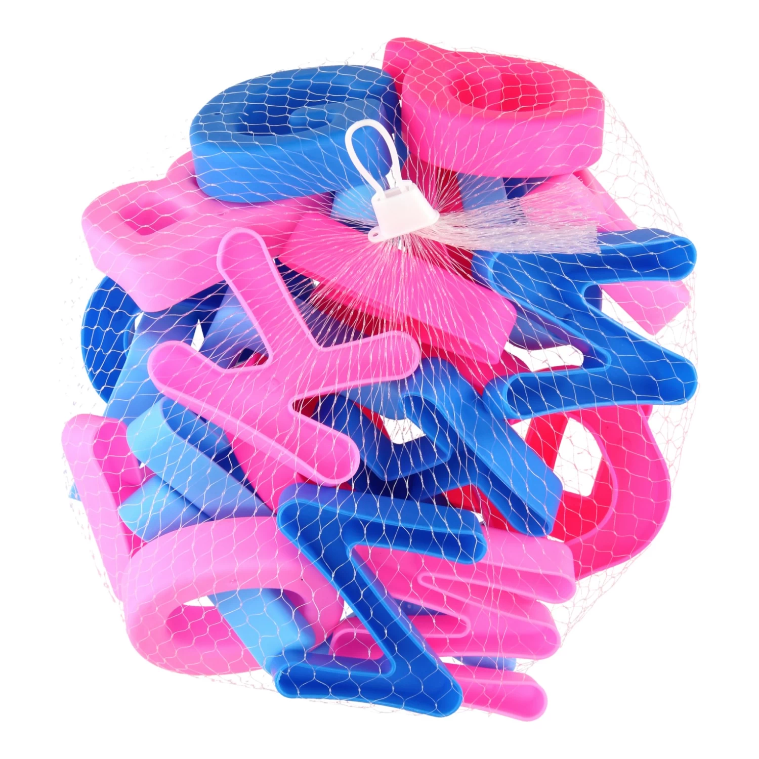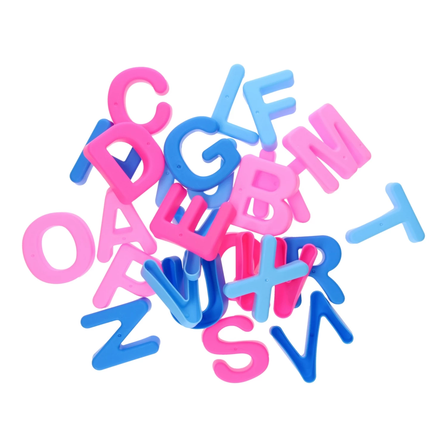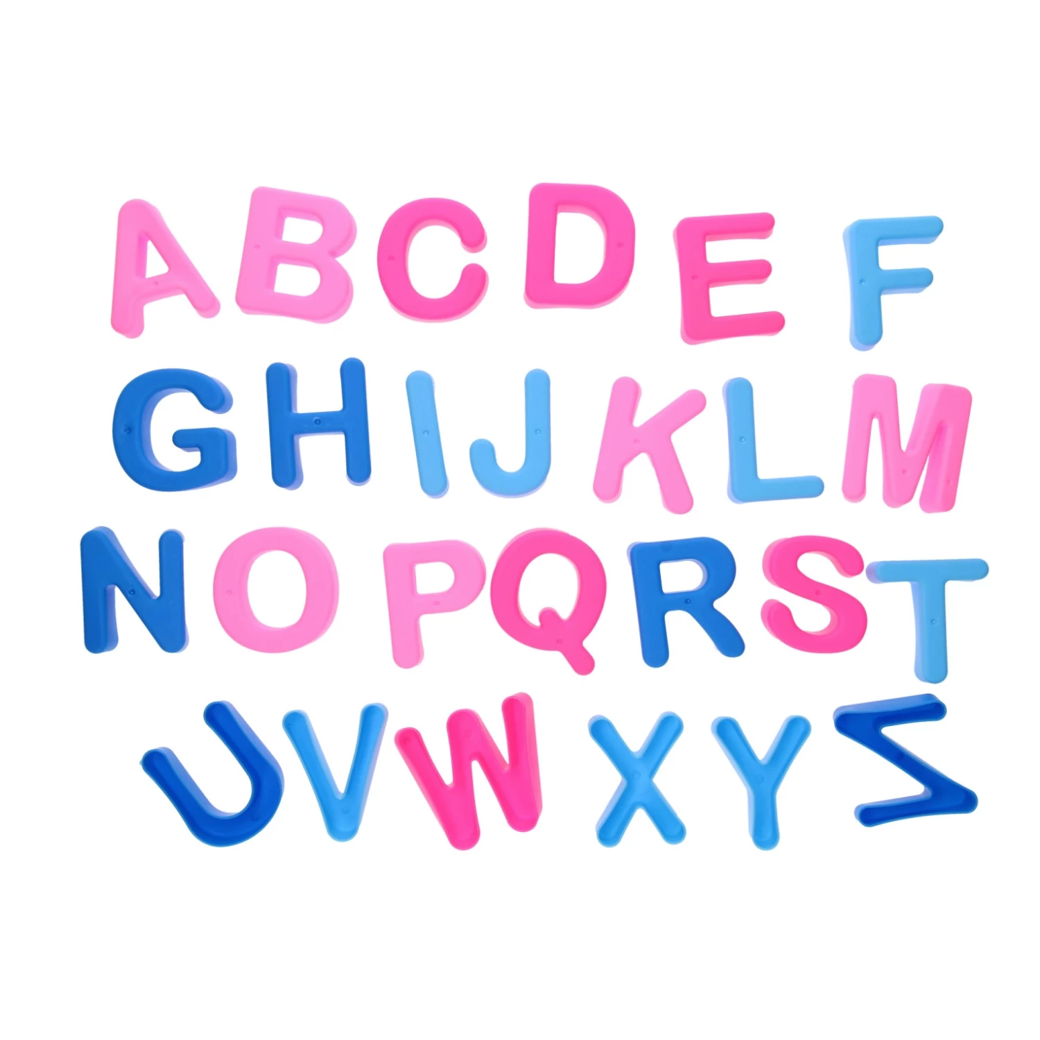 Kunststof zandvormen in de vorm van alle letters van het alfabet. De zandvormpjes zijn in de kleuren lichtroze, roze, lichtblauw en blauw. De letters zijn 7 cm bij 6 cm.